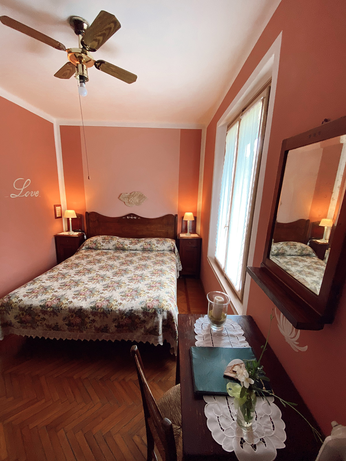 Camera vista giardino di 12 mq . Si trova al primo piano di Villa Schindler, nella parte più antica. Il suo pavimento è in caldo parquet di larice rosso e le travi di legno sono originali e dipinte a mano sono ancora originali di fine 800, ha una finestra vista giardino. Il letto di ferro battuto è fatto a mano, dipinto da Anna Brotto. Il bagno spazioso e luminoso è originale di fine 800 ed è l’unico con vasca da bagno.