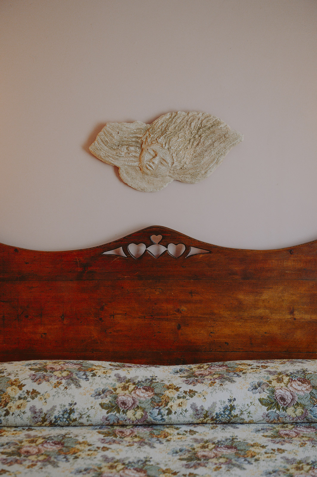 sono impreziositi da opere d’arte di Annamaria Brotto, sul comodino, sul pizzo bianco,